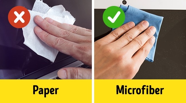 Cách hiệu quả nhất để vệ sinh màn hình là dùng khăn sợi nhỏ. Người dùng có thể thêm một ít nước làm ẩm để lau thay vì phun nước hoặc dung dịch lau trực tiếp lên màn hình. Điều tương tự cũng nên được thực hiện với mặt sau.