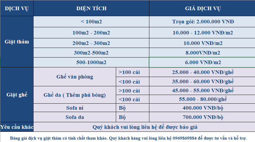 | Bảng giá dịch vụ giặt thảm có tính chất tham khảo. Quý khách hàng vui lòng liên hệ 0969869884 để được tư vấn và hỗ trợ. |