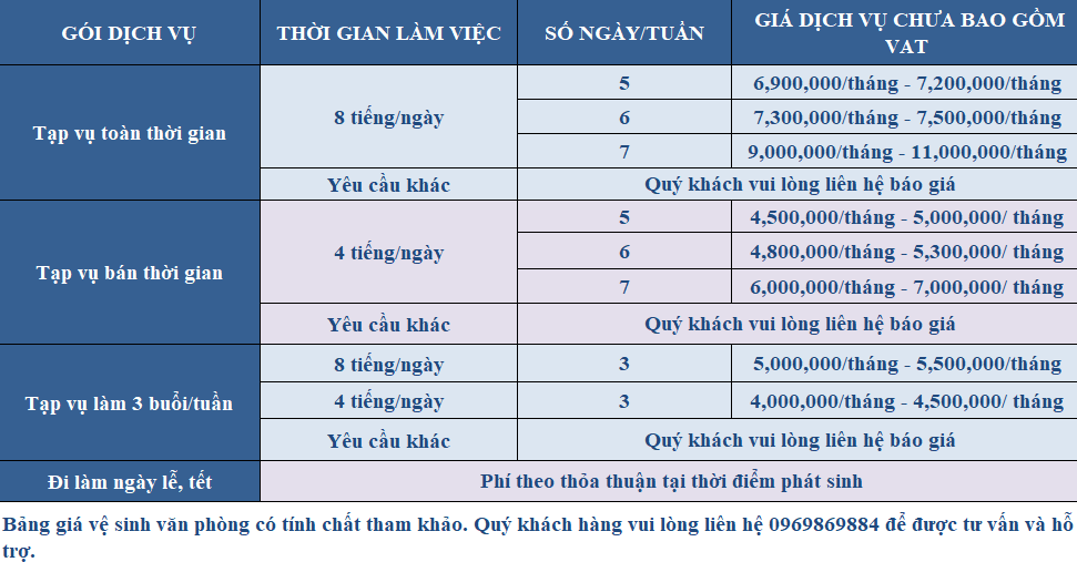 vệ sinh văn phòng của LAMSACH5S, chúng tôi xin cung cấp bảng giá tham khảo cho một số gói dịch vụ phổ biến: